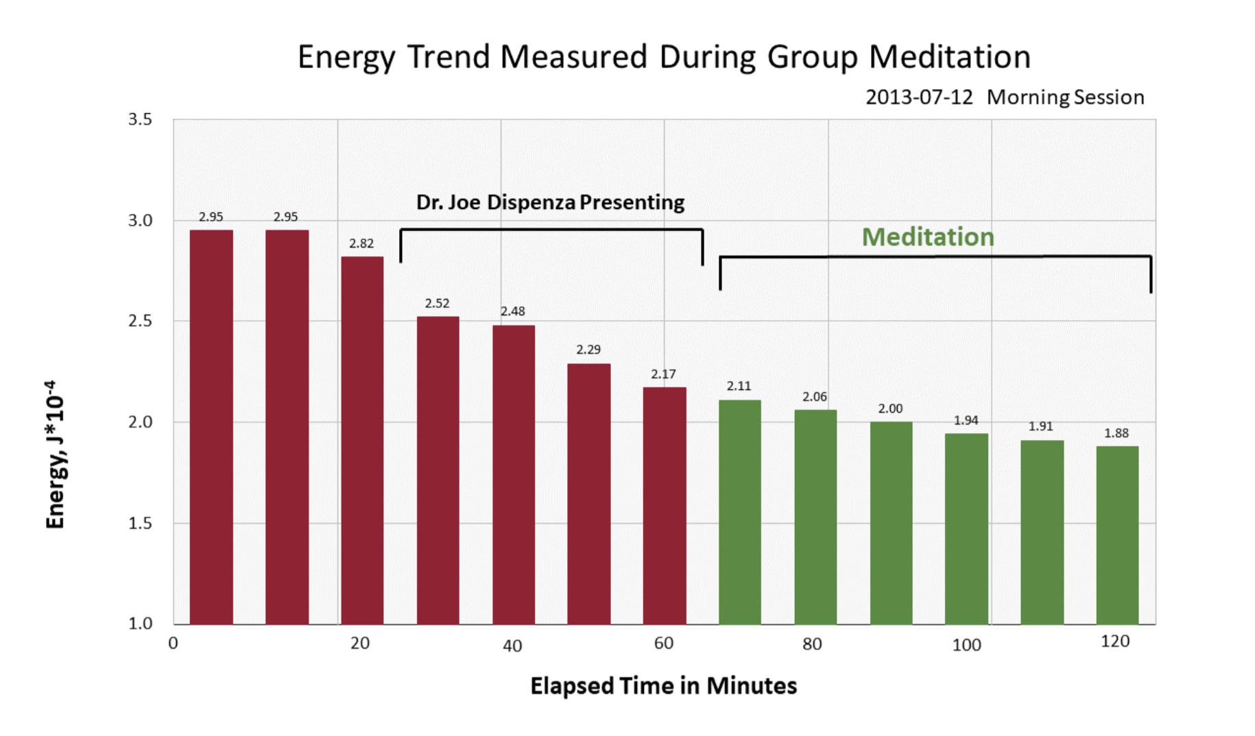 Based on the example graph above, we can see that during the time preceding meditation, the energy in the room was noticeably higher and relatively stable and then began to drop/balance –first beginning with the focused attention on Dr. Joe’s presentation, and continued to further lower/balance during the actual process of him leading the group into meditation. The drop is significant as measured in Joules on the vertical axis over time on the horizontal axis.